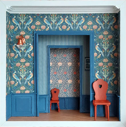 In 2021 ben ik begonnen met het maken van 'Hartkamertjes': kleine sfeerkamertjes, minitafereeltjes of doorkijkjes gemaakt in wandkubussen of diepe lijsten. Ik gebruik karton, roerhoutjes, kralen, allerlei (rest)materialen, veel lijm en verf, en hier en daar een poppenhuismeubeltje of een ander item dat ik in de kringloopwinkel vond. Tezamen vormen ze mijn droomhuis in het klein. Heb je interesse in een kamertje? Neem dan contact met me op via het contactformulier.